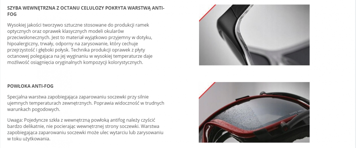 Ramki gogli: materiał TPU (wyjątkowo wytrzymałe tworzywo)Odporność na zarysowania, powłoka lustrzana MIRROR100% filtr UVA, UVB i UVPodwójna szybaSzyba zewnętrzna: poliwęglan (rozjaśnia i wyostrza obraz)Szyba wewnętrzna: octan celulozy (trwały, odporny na zarysowania)Super ANTI-FOG chroni przed zaparowaniem przy niskich temp.Idealna poprawność optycznaDoskonały kontrast obrazuWysoka odporność na stłuczeniaGiętka i elastyczna oprawka chroniąca przed uszkodzeniamiSystem wyprowadzający gumę na zewnątrz kasku (gogle nie uwierają)Wewnętrzna trójwarstwowa gąbka antyalergiczna z wentylacjąRamka: TPU.