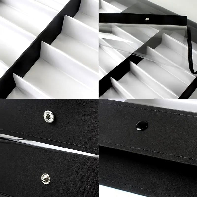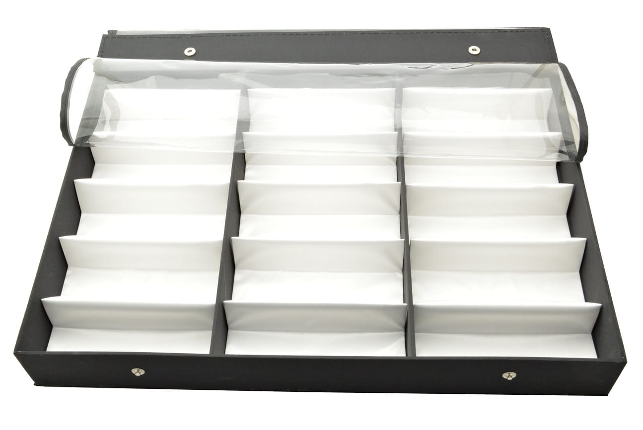 Takie rozwiązanie sprawia, że kuweta prezentuje się bardzo szykownie, a z drugiej strony pozwala w dowolnym momencie zajrzeć do środka. Wnętrze wyścielone jest delikatnym białym atłasem. Kuwety tego rodzaju najczęściej kojarzą się z ekskluzywnymi salonami optycznymi. Nic jednak nie stoi na przeszkodzie, by stały się funkcjonalnym elementem wyposażenia we własnym domu. Dzięki takiej kuwecie spakowanie niezbędnych oprawek czy okularów na dłuższy wyjazd nie będzie żadnym problemem.