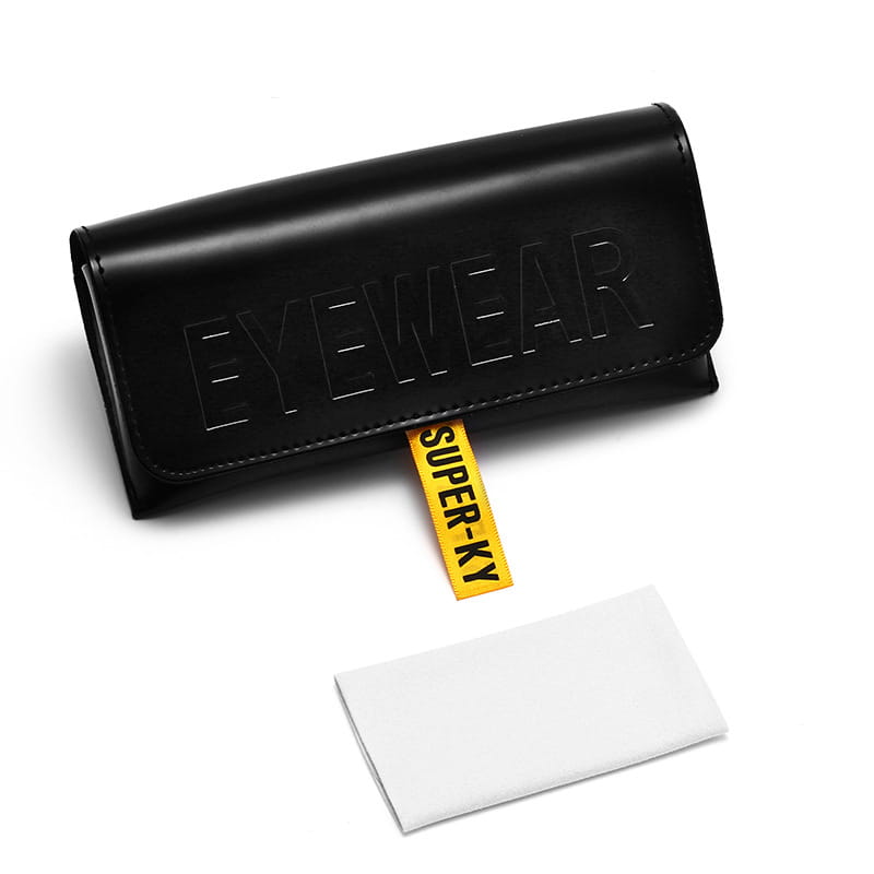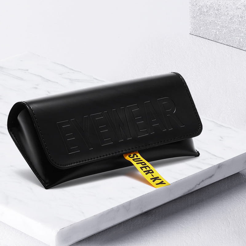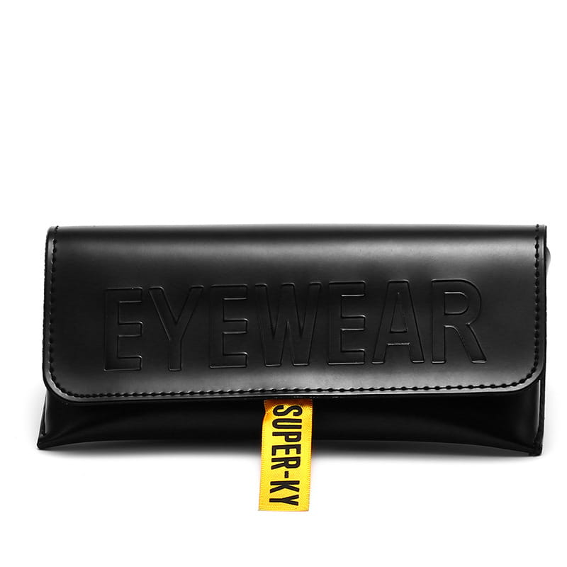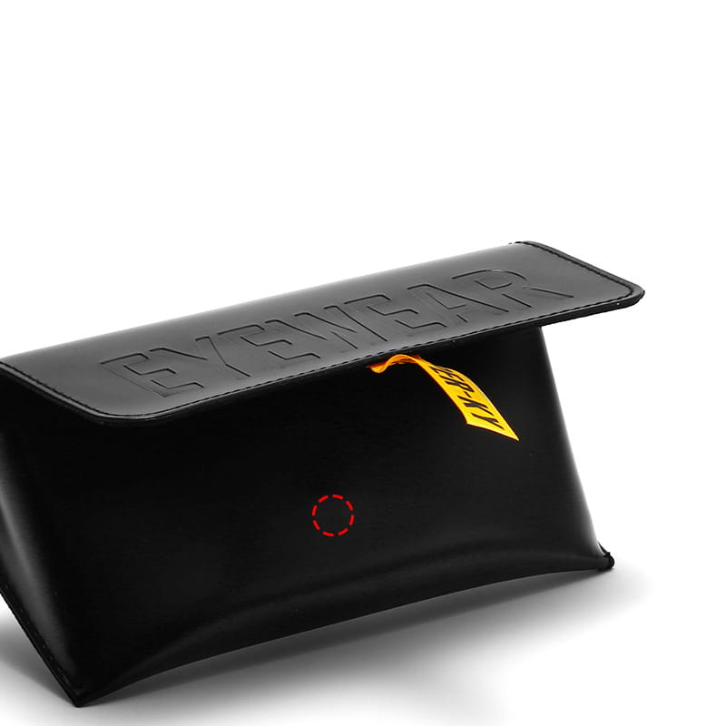 Zadbaj o bezpieczeństwo swoich okularów w dobrym stylu. Etui z zamknięciem na magnes zostało wykonane z wysokiej jakości skóry PU, która doskonale łączy elegancki wygląd z trwałością i odpornością na codzienne użytkowanie. Materiał zewnętrzny prezentuje się estetycznie i nowocześnie, a jednocześnie jest łatwy w utrzymaniu czystości. Żółta tasiemka ułatwia otwieranie a zarazem dodaje eleganckiego kontrastu dla czarnego etui. Duże wytłoczenie EYEWEAR dopełnia całości.