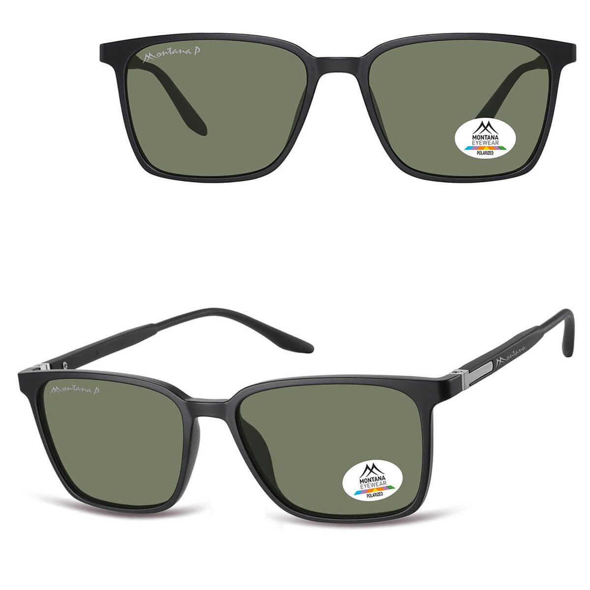 Czarne męskie okulary przeciwsłoneczne polaryzacyjne z filtrem UV400 w kształcie prostokątnym z zawiasami teleskopowymi typu flex marki Montana MP186B