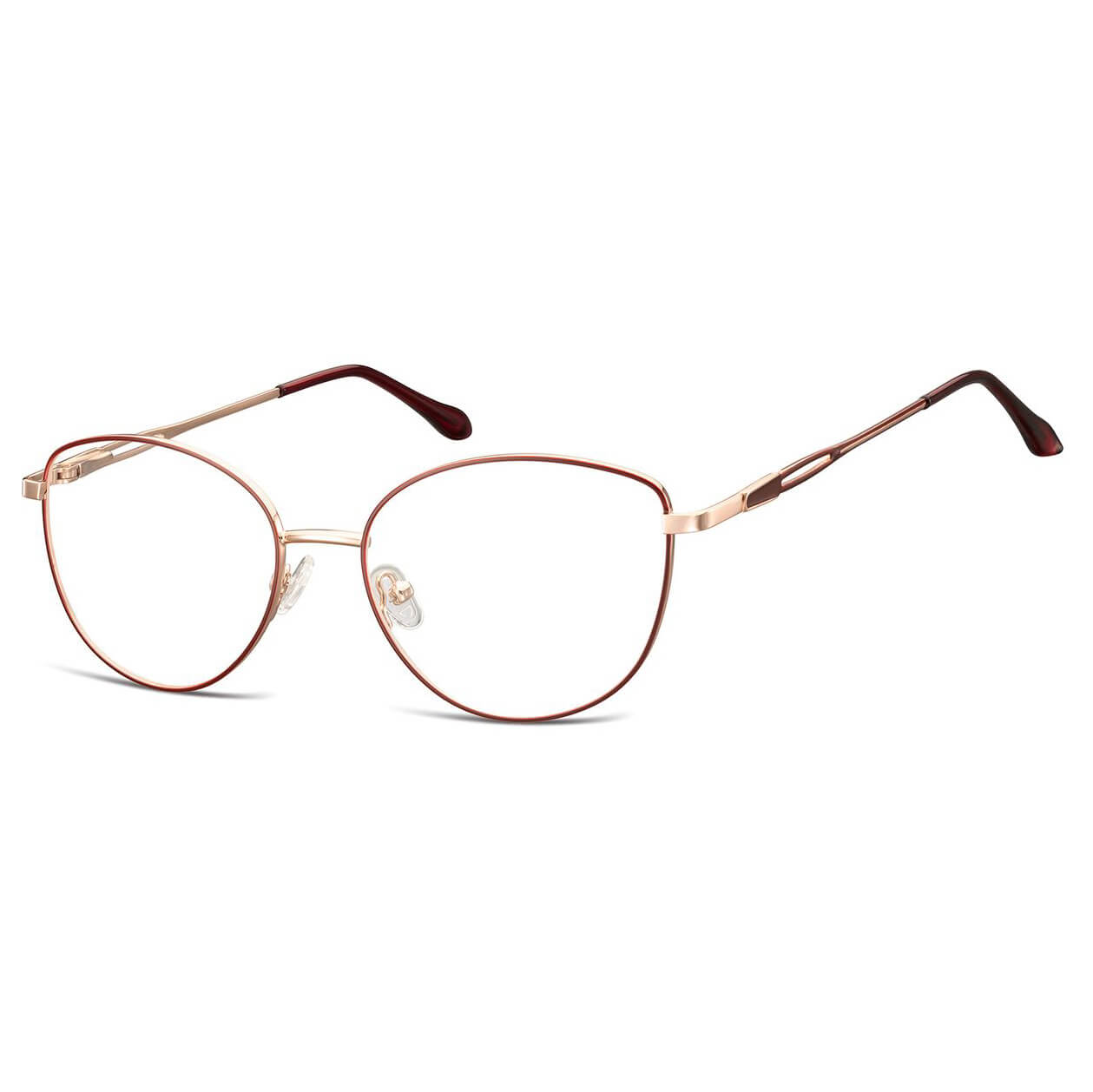Damskie okulary optyczne typu Kocie Oczy przeznaczone pod korekcję lub jako zerówki do uzupełniania codziennej stylizacji ze stali nierdzewnej i tworzywa sztucznego Sunoptic 888B złoto +bordo