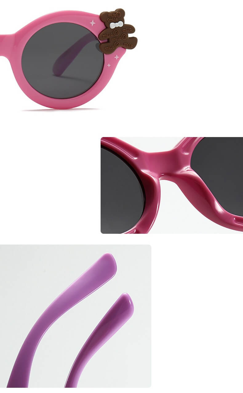 Dziecięce gumowe okulary przeciwsłoneczne z polaryzacją to doskonały wybór dla najmłodszych, zapewniający skuteczną ochronę oczu przed szkodliwym promieniowaniem słonecznym. Oprawki ozdobione są słodkimi elementami w kształcie misiów i kolorowych literek.