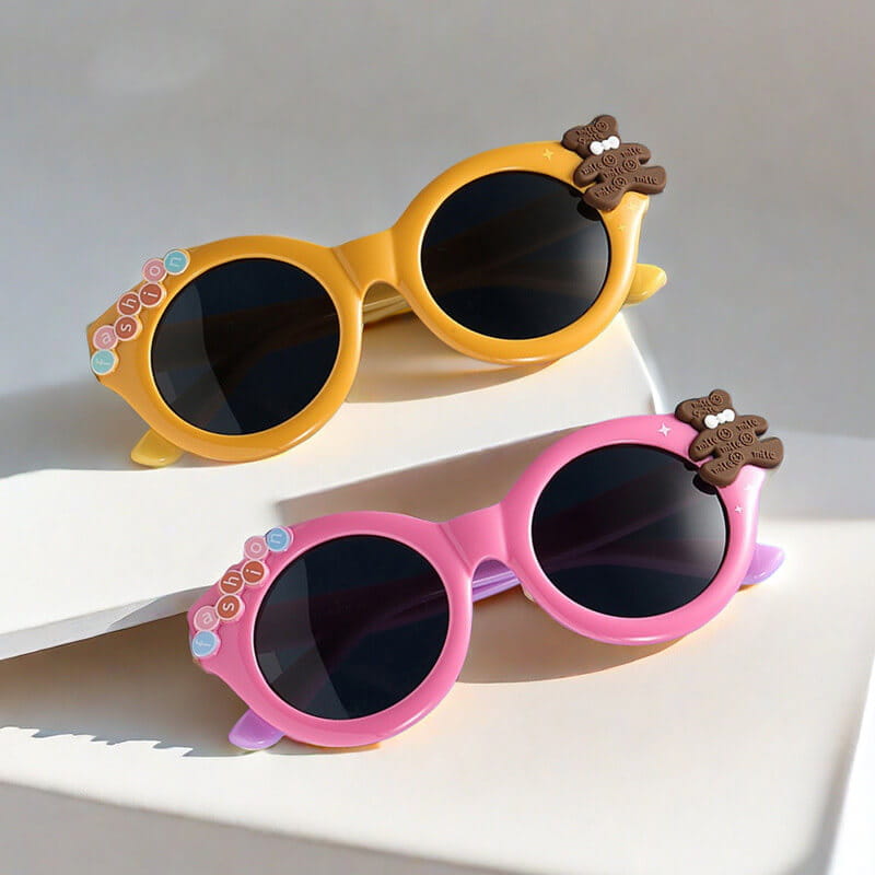 Dziecięce gumowe okulary przeciwsłoneczne z polaryzacją to doskonały wybór dla najmłodszych, zapewniający skuteczną ochronę oczu przed szkodliwym promieniowaniem słonecznym. Oprawki ozdobione są słodkimi elementami w kształcie misiów i kolorowych literek.
