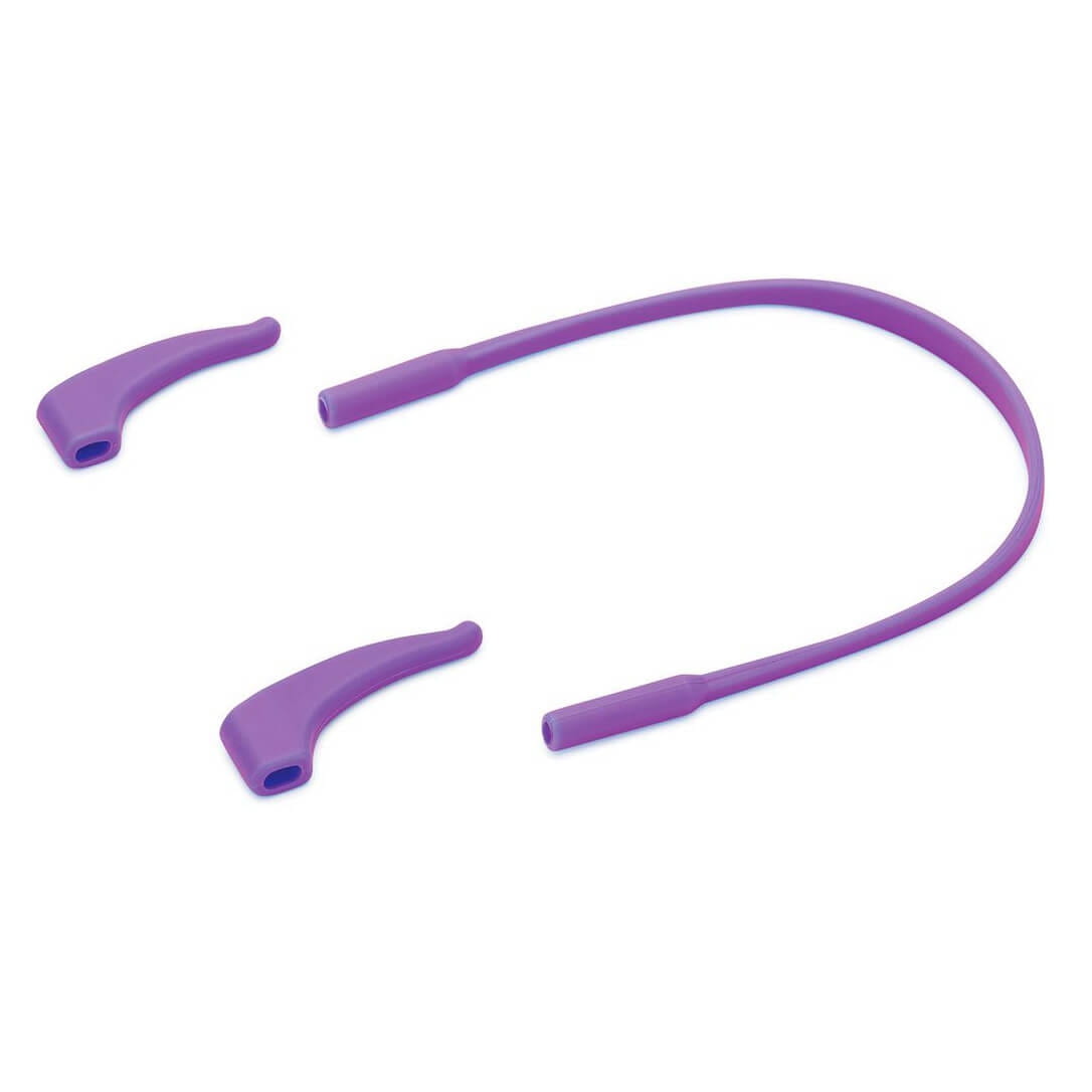 ➤ W zestawie sylikonowa gumka i uchwyty za uszy, dzięki którym okulary nawet podczas fikołków pozostaną na główce dziecka