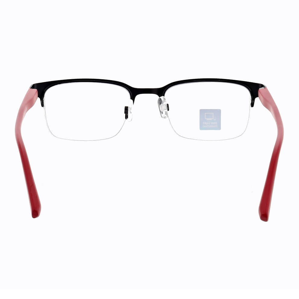 Czarno-czerwone oprawki żyłkowe do czytania o mocy +1.50 dla mężczyzn, z filtrami Blue Light oraz Antyrefleks idealne do komputera, TV lub smartfona w kształcie prostokątnym z akcesoriami prezentowymi