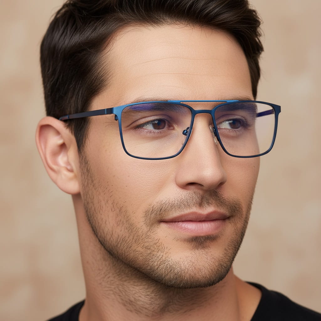➤ Lekka wytrzymała oprawka z trwałej stali nierdzewnej w kształcie prostokątnym w kolorze niebieskim z teleskopami w zausznikach