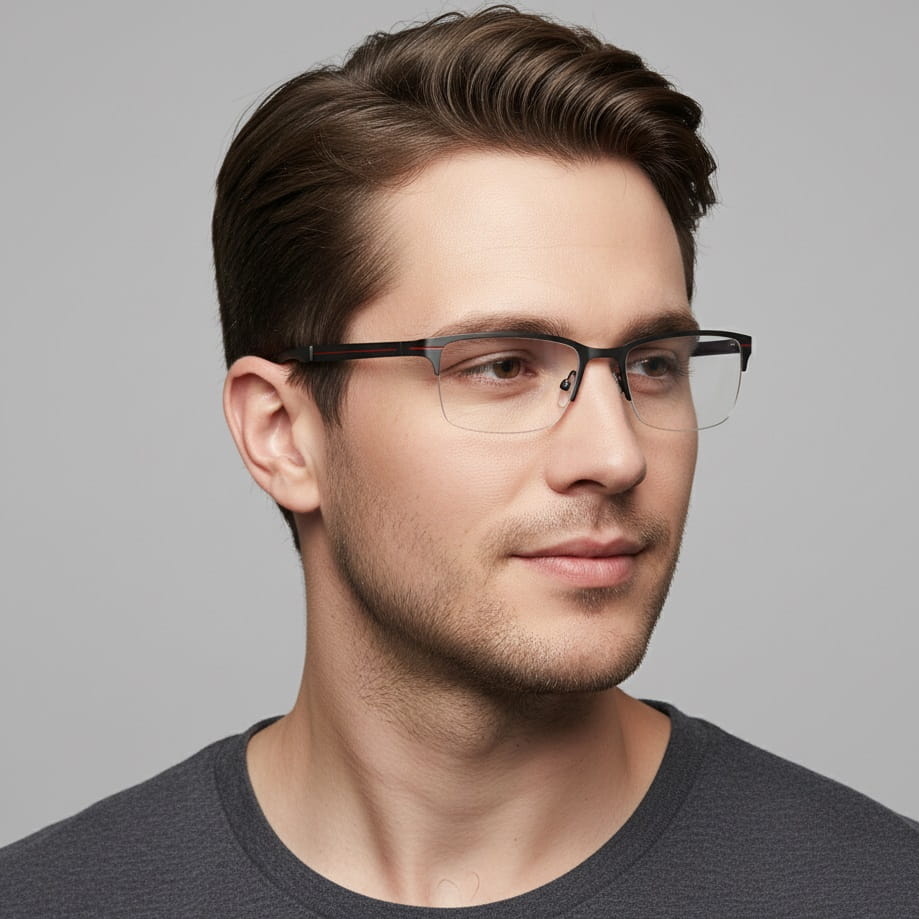 Prostokątny półramkowy model okularów optycznych na żyłce przeznaczony pod korekcję lub jako zerówki do uzupełniania codziennej stylizacji ze stali nierdzewnej.