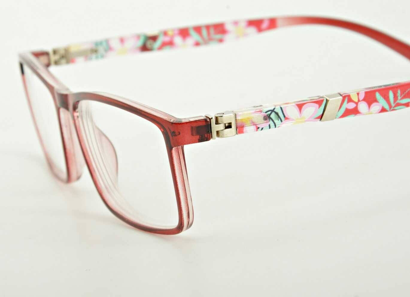 Oprawki w kolorze bordowym w połysku, od wewnątrz transparentne, na zauszniku modny w tym sezonie motyw kwiatowy.