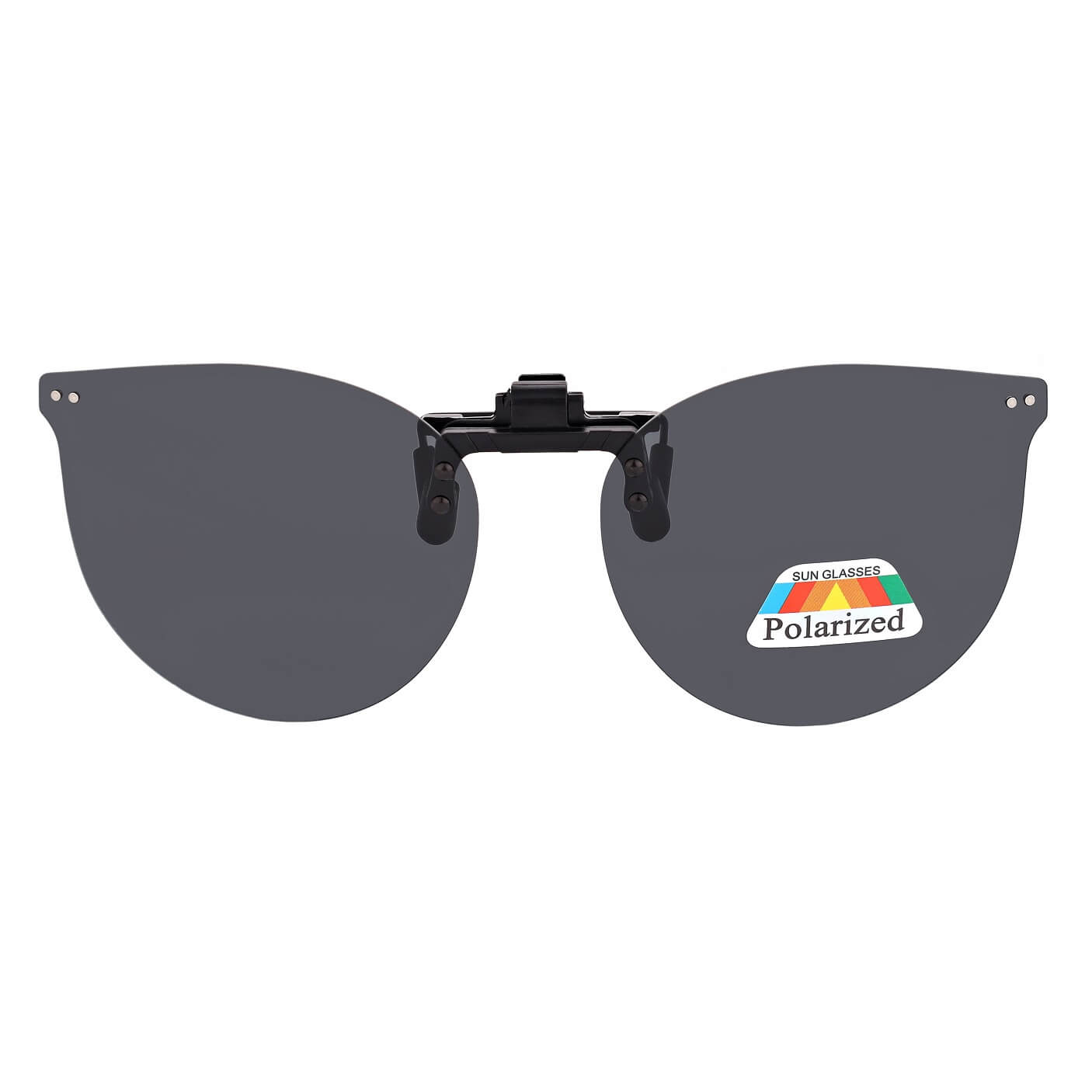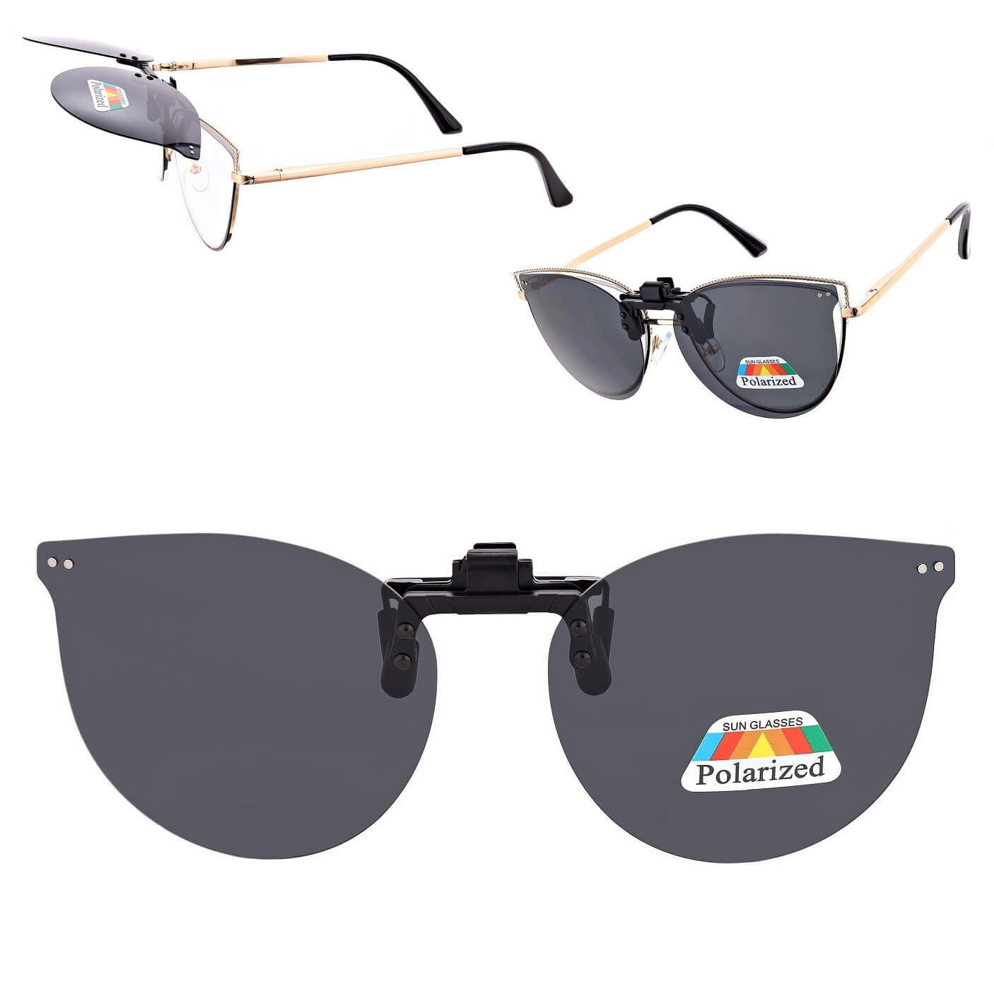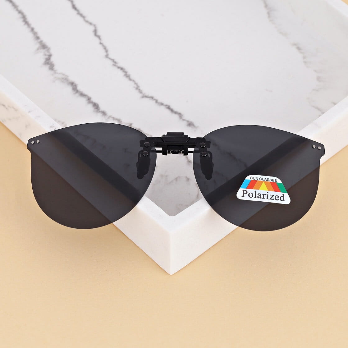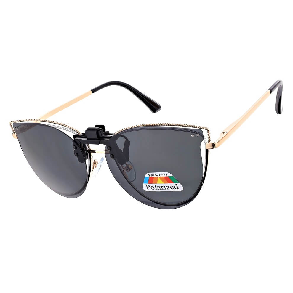 Uniwersalne nakładki przeciwsłoneczne z polaryzacją montowane na klips w kształcie kocich oczu w kolorze czarnym do montażu na okulary korekcyjne.