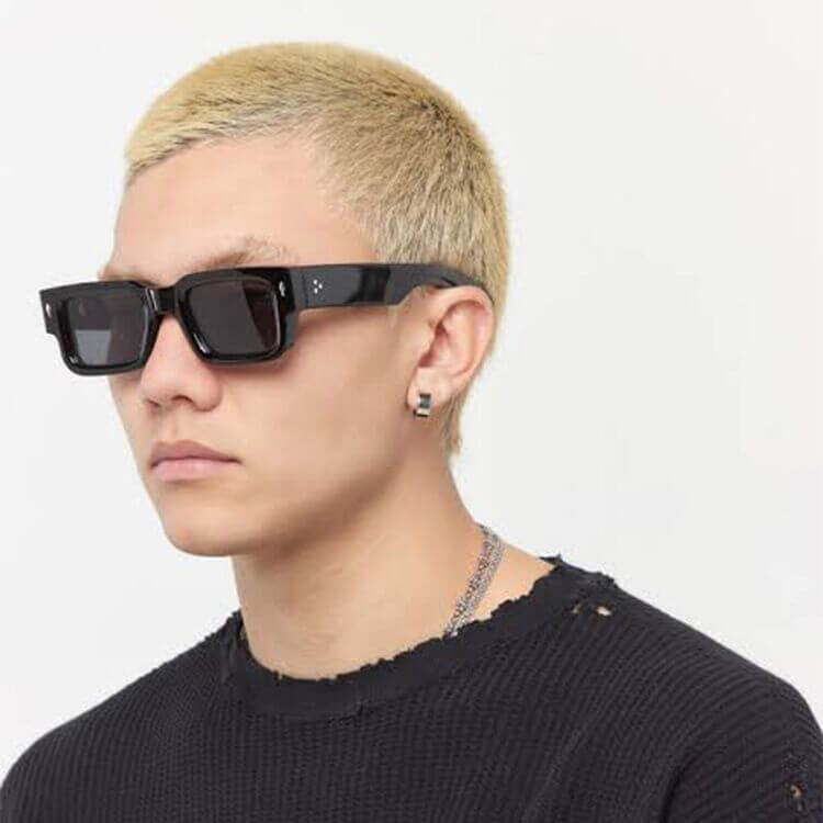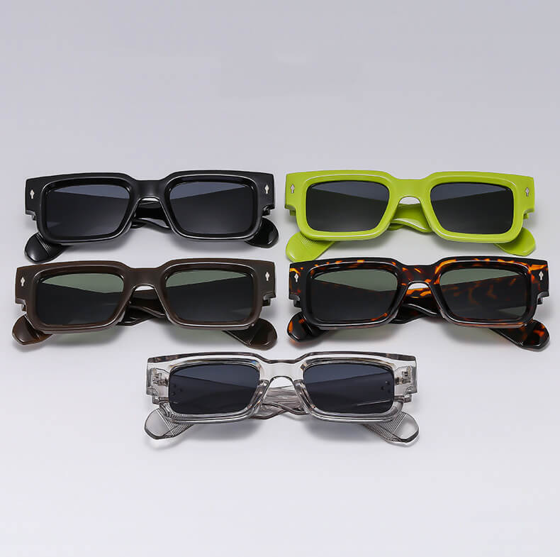 Wyjątkowe okulary w prostokątnym stylu dla niepowtarzalnego wyglądu. Oprawki wykonane zostały z lekkiego lecz solidnego elastycznego poliwęglanu. Okulary posiadają zawiasy metalowe.