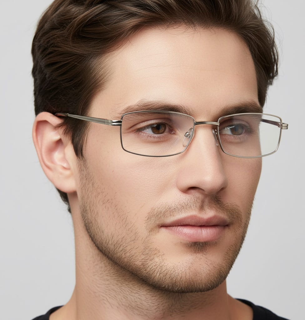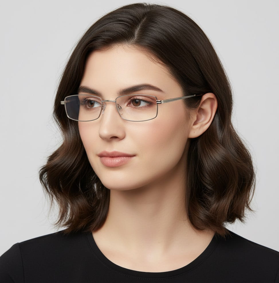 Prostokątny model okularów optycznych przeznaczony pod korekcję lub jako zerówki do uzupełniania codziennej stylizacji ze stali nierdzewnej.