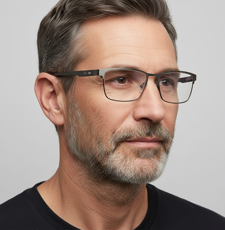 ➤ Pełne metalowe oprawki prostokątne w kolorze grafitowym z teleskopami w zausznikach