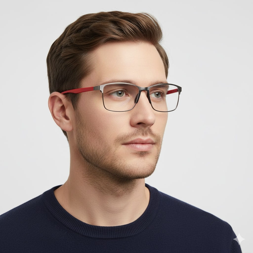 ➤ Metalowa oprawka prostokątna z superelastycznymi i giętkimi zausznikami w kolorze grafitowo-czerwonym z teleskopami w zausznikach