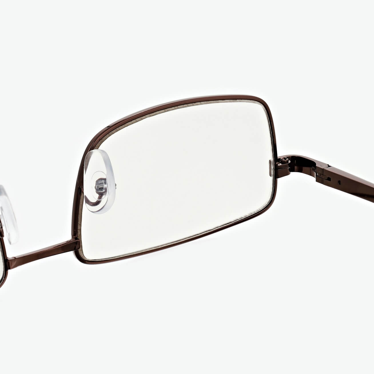 Okulary korekcyjne wykonane ze stali wyposażone w soczewki z fotochromem z funkcją przyciemnienia do kat. 2 i zawiasami FLEX w kolorze ciemnego brązu