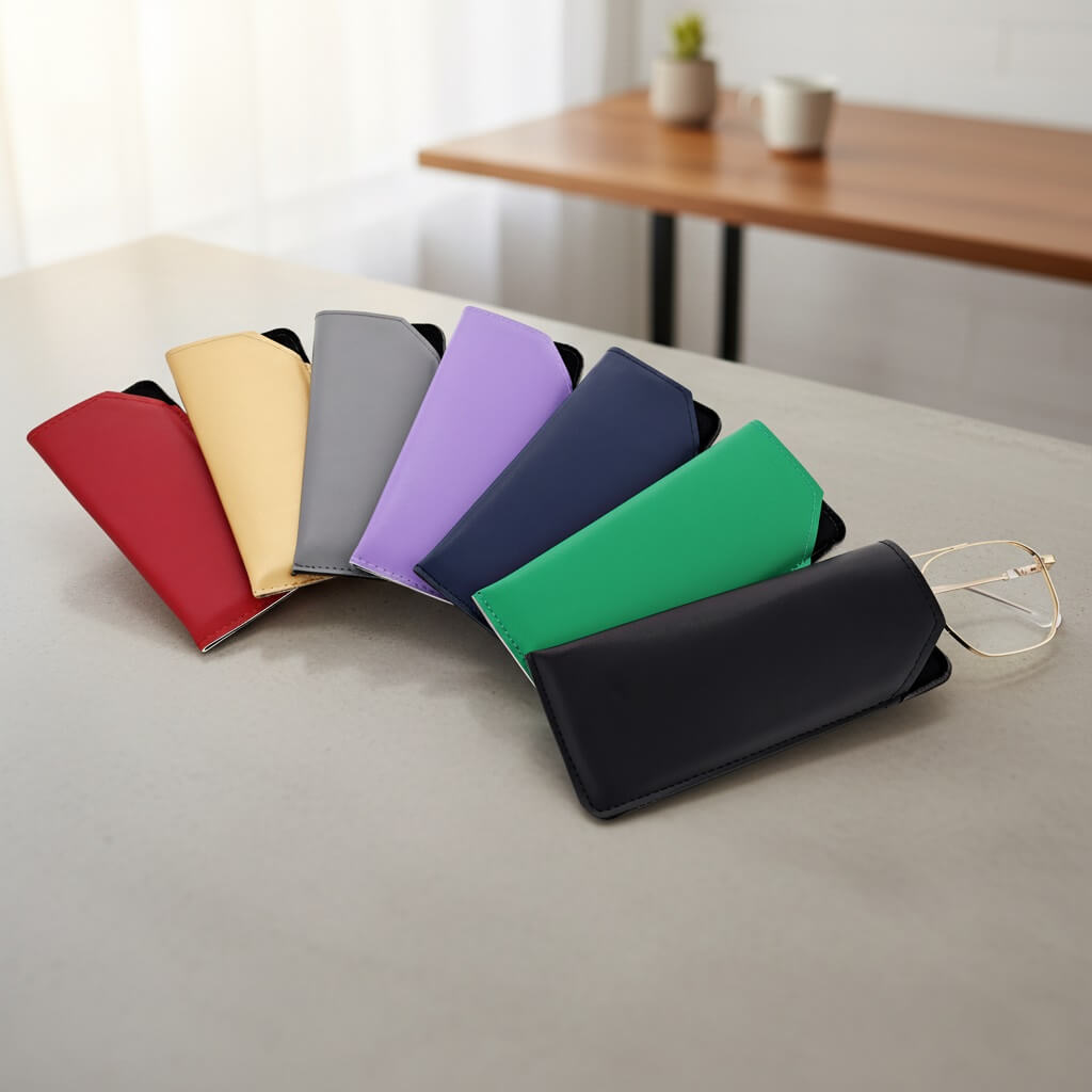 Miękkie etui okularowe w wersji wsuwanej wykonane z eko skóry, obite od środka czarnym materiałowym wnętrzem
