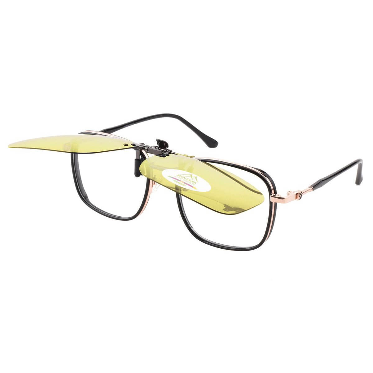 Żółte uchylne nakładki rozjaśniające nakładane na okulary korekcyjne marki Montana